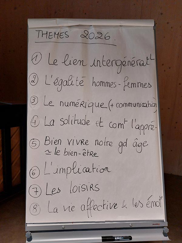 Le thème retenu par les 26 personnes âgées présentes est le suivant : « Bien vivre son âge ». Les participants ont maintenant quelques mois pour plancher sur la question en petits groupes, et présenteront leurs résultats au colloque 2026 !